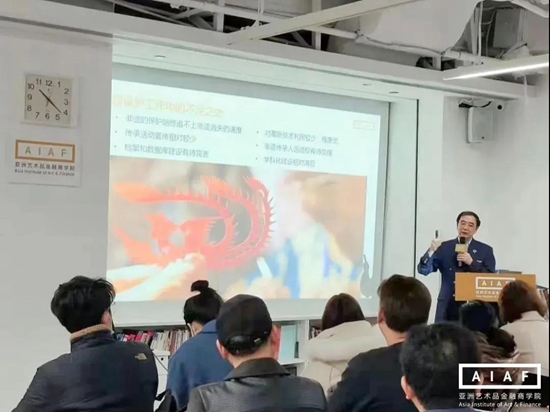 文化和旅游部、教育部、人力资源社会保障部启动了“中国非物质文化遗产传承人群研修研习培训计划”。在文化和旅游部非遗司的指导下,上海市文化和旅游局非遗处的支持下,由上海大学上海美术学院和上海公共艺术协同创新中心承办的“中国非物质文化遗产传承人群研修研习培训计划(上海传统工艺创新设计研修班)”于2021年3月6日上午来到亚洲艺术品金融商学院(AIAF),邀请范勇院长就“非遗传承与艺术金融”为该项目学员们进行授课。