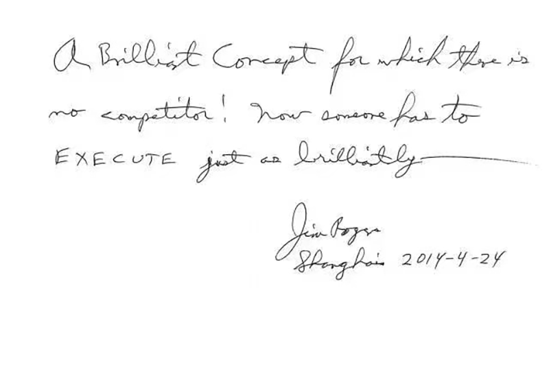 创办学院过程中,还有一个小故事令人不能忘怀。2014年4月23日,我为了找到国内外在艺术品和金融领域有影响力,愿意支持我创办学院的人士,经过很多曲折,经纽约联合国朋友杨女士引荐与著名的金融投资家、量子基金创始人之一的吉姆·罗杰斯先生见面,没想到与他一见如故,交流非常愉快,他还给我看了他6岁女儿背诵唐诗“一去二三里、烟村四五家……”,他对创办这样创新的学院非常感兴趣,马上就拿出支票本,要捐赠钱,我说不要钱,我想你给我的学院写一个寄语,他非常有智慧,马上在酒店的信笺背面写下了几句话“这是一个充满智慧的伟大想法,也是一个没有任何竞争的领域,但实现它需要有与这智慧媲美的行动力。”这句话给我很大鼓舞,也是对学院未来发展的一个鼓励和建议!