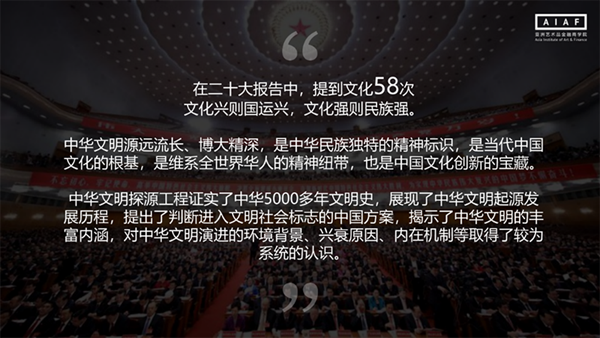 在二十大报告中,文化一词就提及了58次。这是一个高感性的名词,也是我们所有人需要关注之处。中华文明探源工程,它首次被列为国家战略。中华文明探源工程证实了中华5000多年文明史,展现了中华文明起源发展历程,提出了判断进入文明社会标志的中国方案,也揭示了中华文明的丰富内涵。未来中国的发展会迎来民族优秀传统的复兴,我们期待能有更多参与和贡献!于己于家于国,我们都要把家国情怀放在心里,做中国民族文化艺术复兴百年大计的长期主义者!
