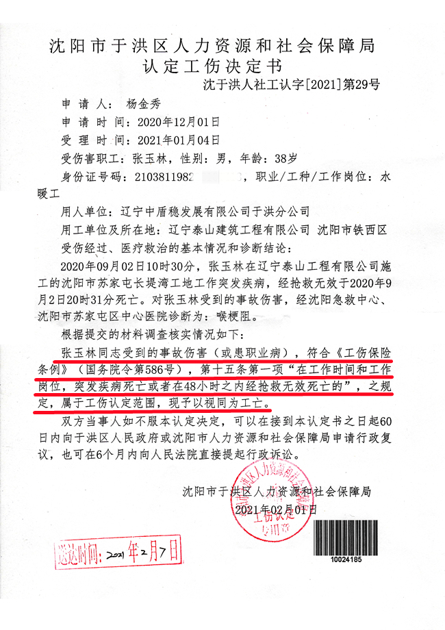 2020年12月1日,杨金秀以个人名义重新向沈阳市于洪区人力资源和社会保障局申请,2021年1月4日,该局下达了《工伤决定书》:张玉林同志受到的事故伤害,符合《工伤保险条例》(国务院令第586号)第十五条第一项“在工作时间和工作岗位,突发疾病死亡或者48小时之内经抢救无效死亡的”,之规定,属于工伤认定范围,现予以视同为工亡。