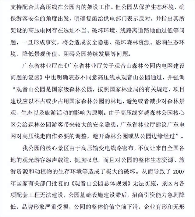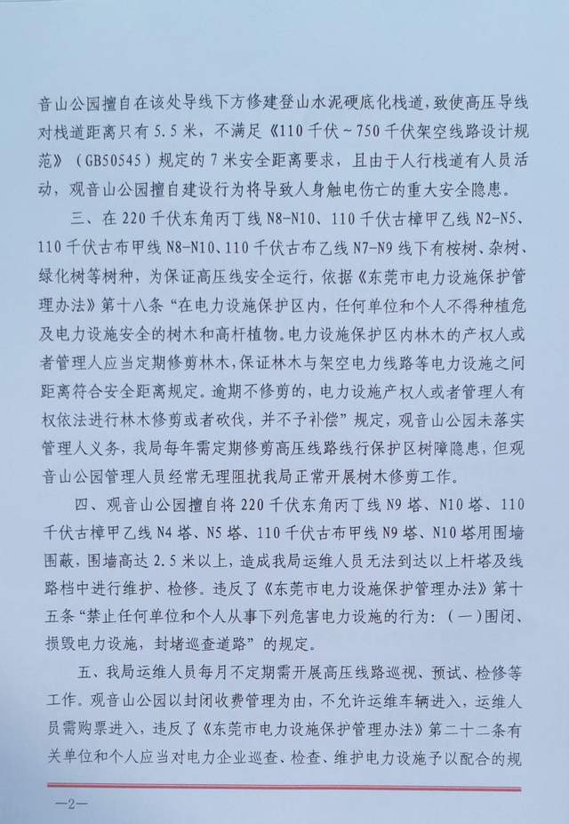 自2002年开始,南方电网旗下广东电网公司东莞市供电局在未经观音山方同意,审批手续不齐全的情况下(未向公园方提供国家林业、国土资源等部门关于同意在公园内架设高压线塔的批复文件),就先后毁林施工,将多组高压线塔强行架设在观音山国家级森林公园内,从而大面积破坏公园核心地段的林地及影响了公园整体形象。同时,这些高压线塔均穿行架设在公园主要游客通道上空,且未按要求升高架设。景区路基较高处,高压线距离地面仅为4米多,打雷下雨天,极其容易发生山火等安全事故,危险异常。