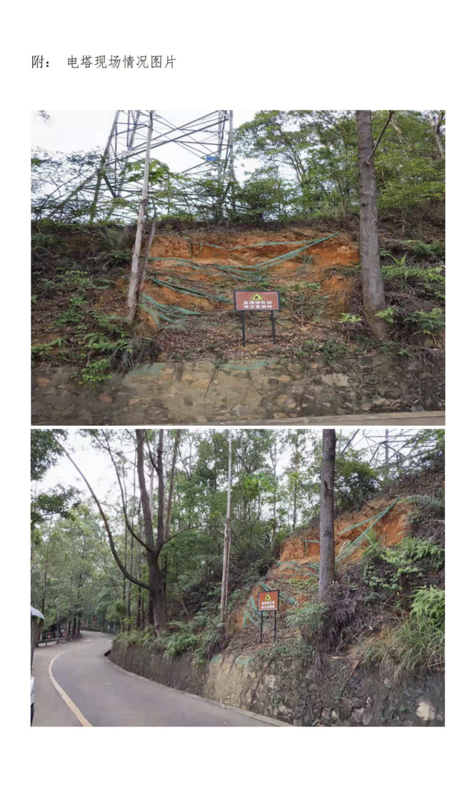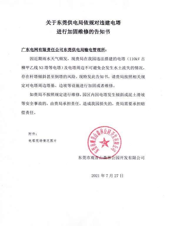 2021年7月27日,因雨水天气频发,东莞观音山方面发函敦促东莞市供电局,尽快依法依规对观音山公园内因违法架建而导致山体塌方形成的倾斜电塔的塔基进行维护加固。