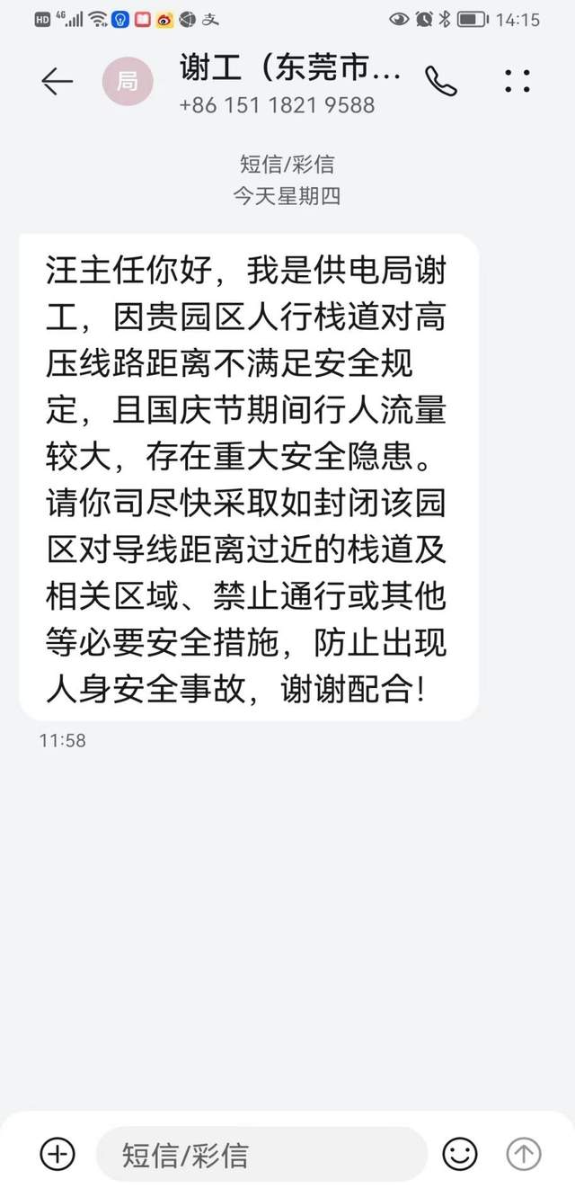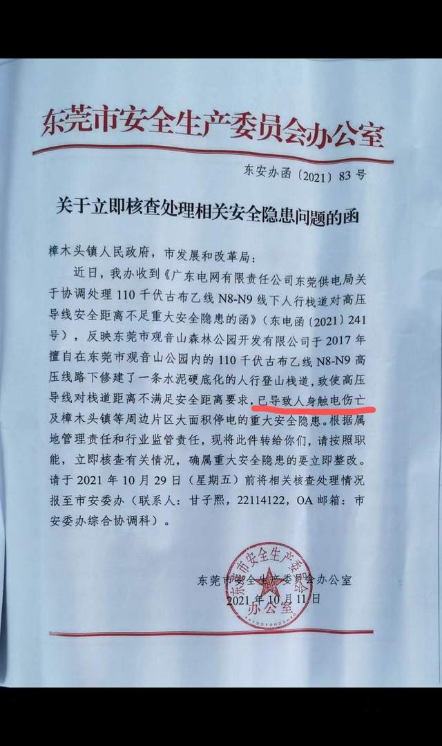 本来,东莞市供电局应该是一个为百姓为企业“发光”的国企单位,这次却完全一条道走到黑,再一次展开了疯狂报复。2021年9月28——10月11日,供电部门连续十几天里,向当地政府、安委、应急近10个部门发函称:因观音山擅自修建人行栈道,致使高压线不满足安全距离,导致已有人触电身亡和大规模停电。