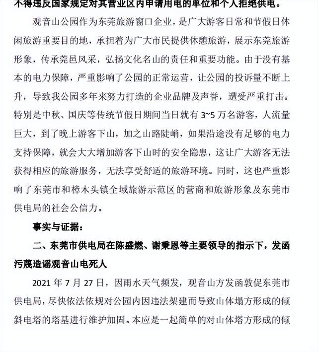 二、然而,东莞市供电局避实就虚、故意歪曲的回复内容,与发生在观音山的事实严重不符。深受欺凌折磨的观音山于2022年3月6日就南电案事件正式向南方电网纪检委、广东电网有限公司纪检委、东莞市纪律检查委员会进行反映,反映其供电部门及相关领导有法不依,并于3月7日委托律师谴责其推诿塞责不作为等行为。