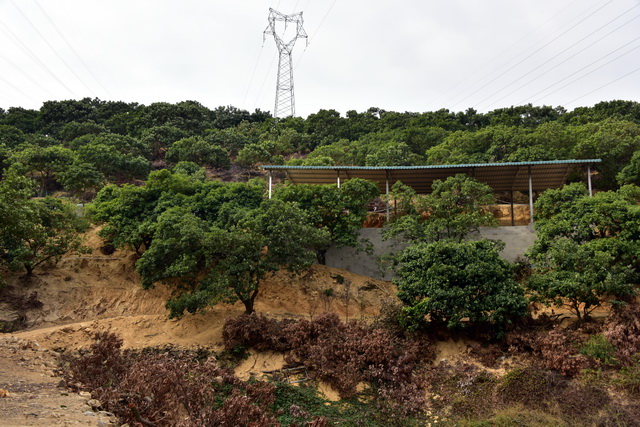 穿过这片建筑群,便是靠近仙泉水库的成片山林。这里半山腰以下的原始次生林早已被砍光,种上了荔枝树。荔枝林和山体上部原始次生林的林相差别明显,像贴了一块块补丁。山坡上开出了一条弯弯曲曲的宽3米左右的土路,以方便施工和运输车辆通行。沿线山体裸露,有水土流失的痕迹。