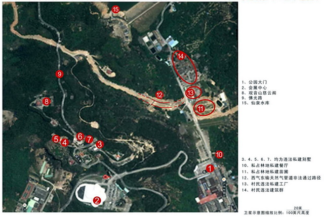 沧州科技事务司法鉴定中心勘查观音山国家森林公园内违法毁林私建别墅、工厂、商店等建筑物。资料来源:广东观音山国家森林公园