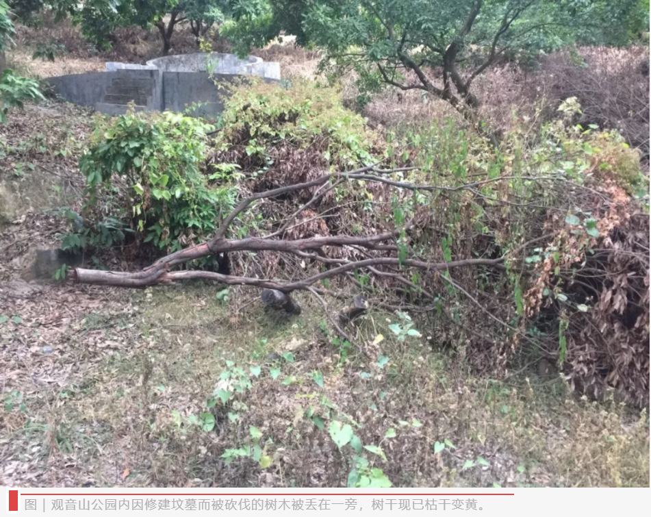 对林业部门的这番解答,陈景玉哭笑不得,他对记者说,墓碑上明明刻着“2017年”等醒目的文字,“有关地方政府部门就是佯装不见,我们很无奈,有种投诉无门的感觉”。他进一步说,砍伐原始树木修建墓地不仅破坏了园区自然生态环境,还破坏了自然生态景观。对此,陈景玉进一步解释,“树木和植被等自然生态环境的破坏直接导致水土流失以及动物、植物栖息地的减少;天然的自然景观是园区的一种旅游产品,是一道靓丽的风景线,一旦受到破坏,将严重影响观音山公园5A级景区的申报和评定工作。如果对于破坏生态环境的违法行为,再不进行制止和查处,那么这一国家级森林公园甚至有被降级和摘帽的可能,将严重影响公园的经营和管理工作,这是对生态效益、经济效益、社会效益和政治效益的整体伤害。”