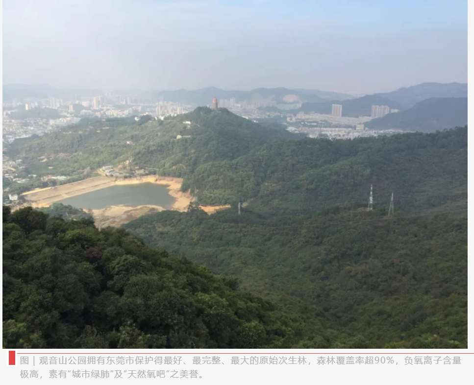 广东观音山国家森林公园(以下简称“观音山公园”)经国家林业局批复的园区面积有657.18公顷,拥有东莞市保护得最好、最完整、最大的原始次生林,森林覆盖率超90%,负氧离子含量极高,素有“城市绿肺”及“天然氧吧”之美誉。观音山公园动植物资源丰富,园内现有1000多种植物,国家级保护植物22种,至少有7种是濒危物种,如国家一级保护植物金茶花,动物有兽类、飞鸟类、甲壳类、昆虫类等300多种。