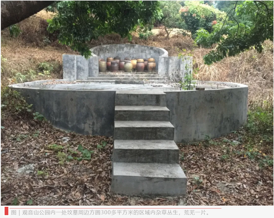 对此,观音山公园管委会主任陈景玉在接受记者采访时表示,“园区内发现大小墓地20余处,占地面积从50平方米到300平方米不等,其中有7、8处是最近十来年新建或翻建的,最新的一处墓地是2017年修建的,占地300平方米,称其为豪华坟墓一点也不为过。”