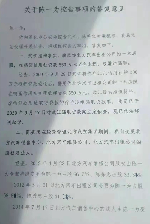 “答复意见”中第一项称武江虚构事实,骗取你北方汽车出租公司的一本房证,在鸭园信用社贷款550万元至今未还,涉嫌诈骗罪。公安机关的“答复意见”,只说武江借用我北方的房照在鸭园信用社抵押贷款,提供了虚假的材料,涉嫌骗取贷款罪,目前已依法移送起诉。而对武江虚构开发事实,骗取我公司房照十年不还,造成我近千万元损失,是否构成诈骗犯罪却只字不提。我在公安机关举报时说的非常清楚,武江虚构开发北方汽贸所在地,需要前期费用,才向我借的房照贷款。但十年来并没有开发,贷款资金却不知去向,难道公安机关没调查出来吗?难道诈骗银行贷款就构成犯罪,对于诈骗我北方汽贸就不构成犯罪吗?公安机关为何对于我北方汽贸是否被诈骗没有正面回答?这其中到底有啥隐情?