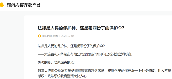 法律是人民的保护神,还是犯罪份子的保护伞? 大连百利天华制药有限公司虚假破产案叩问公检法的法律良知 炎炎的夏,吹来凉爽的风! 随着大连市公检法系统杨耀威等高官悉数落马,...