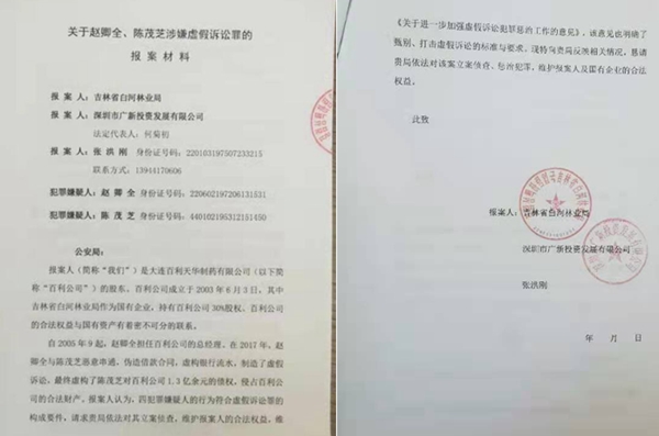 2017年3月白河林业局报案、广新公司举报赵卿全,大连市甘井子分局予以立案。