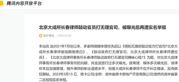 本站讯 自2021年7月份以来,多家网络媒体曾经先后以《明知无理却鼓动官方打官司?北京大成所长春律师被指颠倒黑白》、《鼓动政府打无理官司,北京大成律师所长春律师遭投诉》、《北京大成律师事务所长春律师鼓动政府打无理官司赚昧心钱?》为题,对北京大成律师事务所长春律师事务所的刘颖、肖金波进行过多次曝光。按常理,媒体多次曝光后,该律所本应加强管理,提升律师的职业道德水平,但是大成所长春律师不仅不纠正错误,反而疯狂删帖。2023年3月13 日,德卡公司(全称:吉林省德卡房地产开发有限公司)愤然向吉林省第二巡视组实名举报。