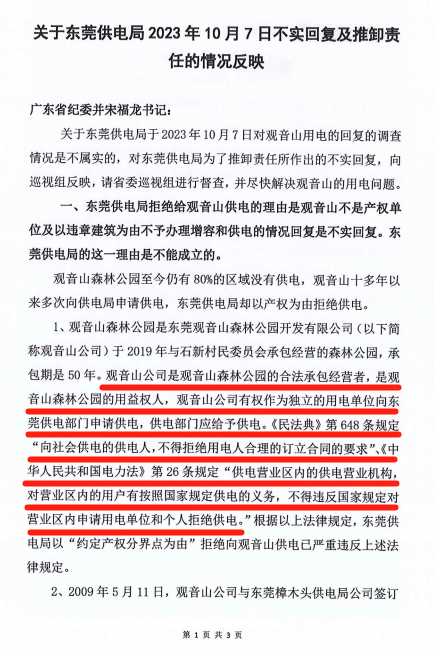 观音山公园认为广东电网有限责任公司东莞供电局虚构事实,因此不服其给予的回复,并于11月1日再次向广东省纪委递交了书面材料《关于东莞供电局2023年10月7日不实回复及推卸责任的情况反映》。