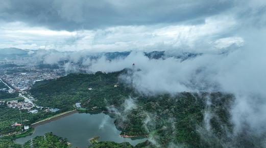 空中俯瞰广东观音山国家森林公园自然风光。 岭南四月,莺飞草长,风轻雨润。南粤大地处处云雾弥漫,春意盎然,呈现出一幅清新的水墨画卷。 位于广东东莞樟木头镇的广东观音山...