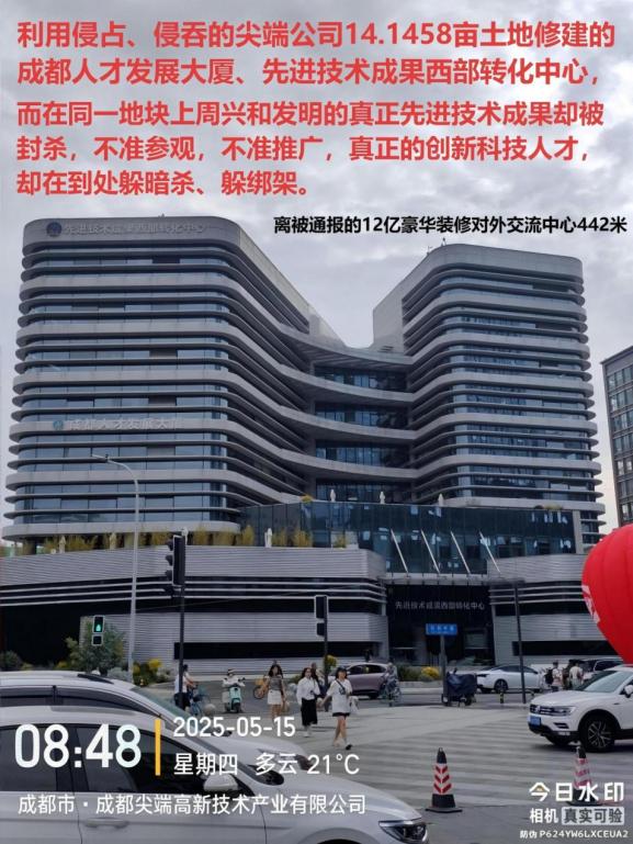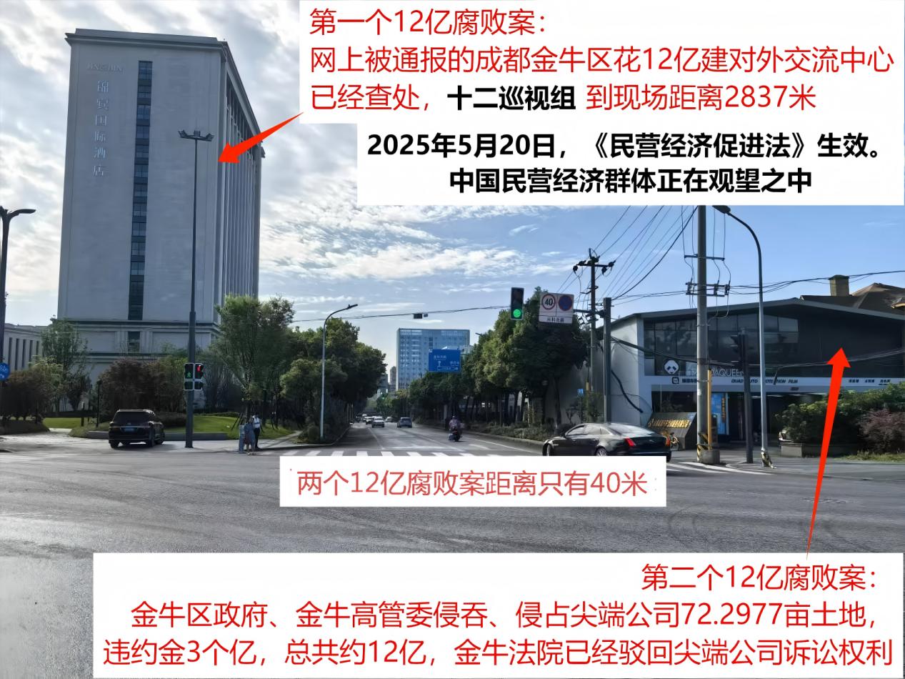 近日,记者根据举报材料上的联系方式找到了尖端公司。据该公司负责人王先生介绍,2024年11月12日,成都市金牛区投资12.16亿元建设的对外交流中心因“豪华装修”被中央公开通报,而与之仅有40米的距离就是尖端公司。王先生说:“金牛区政府、金牛区高管委侵吞、侵占尖端公司72.2977亩土地,23年来,违约金已经高达3个多亿,土地市值更是达到了12亿多。”