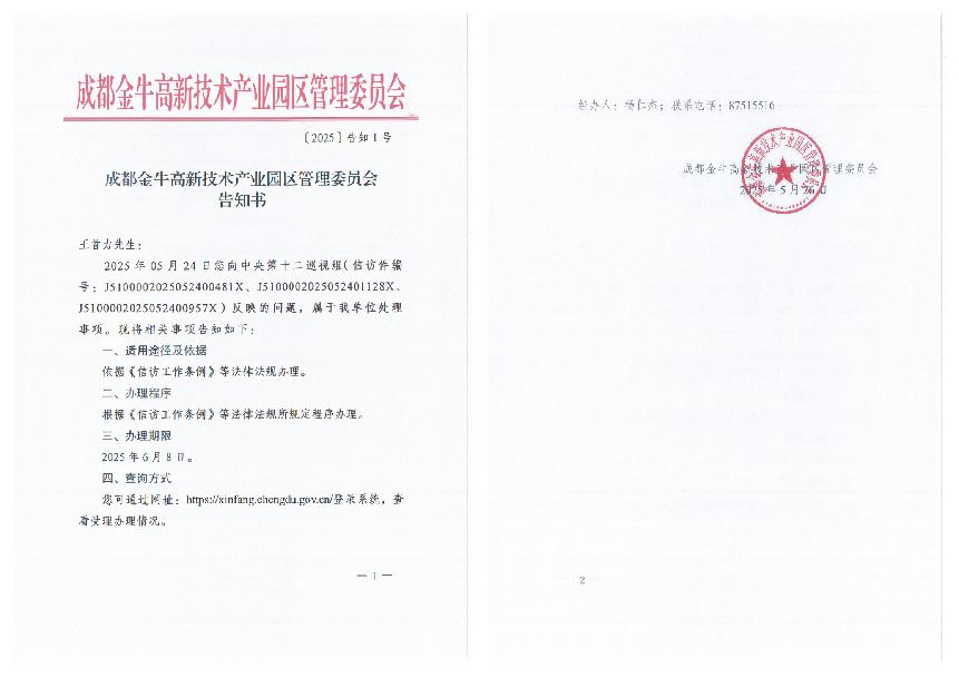 令人欣喜的是,中央第十二巡视组已于2025年4月15日进驻四川省开展常规巡视,此次巡视为期两个半月。尖端公司负责人王先生高兴地告诉记者,公司员工经过不懈努力,分别在5月7日、10日和13日拨通了巡视组公开的电话,并详细向巡视组反映了尖端公司的相关情况。同时,按照巡视组的要求,尖端公司还分别于5月7日中午12:00、14:49分,5月13日10:00、11:09分,5月18日10:48分,5月25日10:46分邮寄了6份反映问题的材料,邮政物流信息显示,这些材料已全部被巡视组签收。5月26日,金牛高管委党群工作部黄部长电话告知尖端公司,称尖端公司向中央第十二巡视组反映问题的相关信访件已经按照程序转至金牛高管委(【2025】告知1号),金牛高管委将于6月8日以前进行回复。
