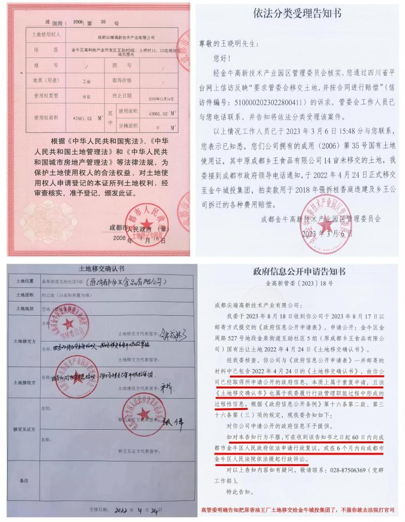 王先生说,2023年3月6日,金牛高管委不知何故竟然书面回复与尖端公司没有任何关系的王晓明先生:“你们公司拥有的成用(2006)第35号国有土地使用证,其中原成都乡王食品有限公司12亩未移交的土地,我委接到成都市政府领导电话通知,于2022年4月24日正式移交至金牛城投集团,拍卖款用于2018年强拆桂香庭违建及乡王公司拆迁的各种费用赔偿。”但当公司追问是成都市人民政府哪个领导打的电话?是谁给他的权利?金牛高管委相关领导则一直默不作声不愿回答。