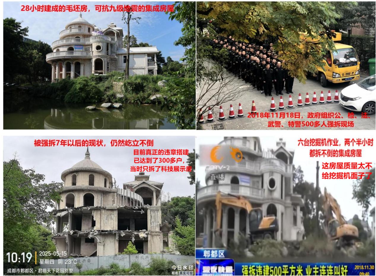 王先生告诉记者,更可气的是2018年11月28日,由金牛区政府牵头,组织了8个区的公检法、武警和特警500多人采用武力、暴力强拆了由尖端公司耗时28个小时修建的可抗9级地震的装配式建筑科技展示房。