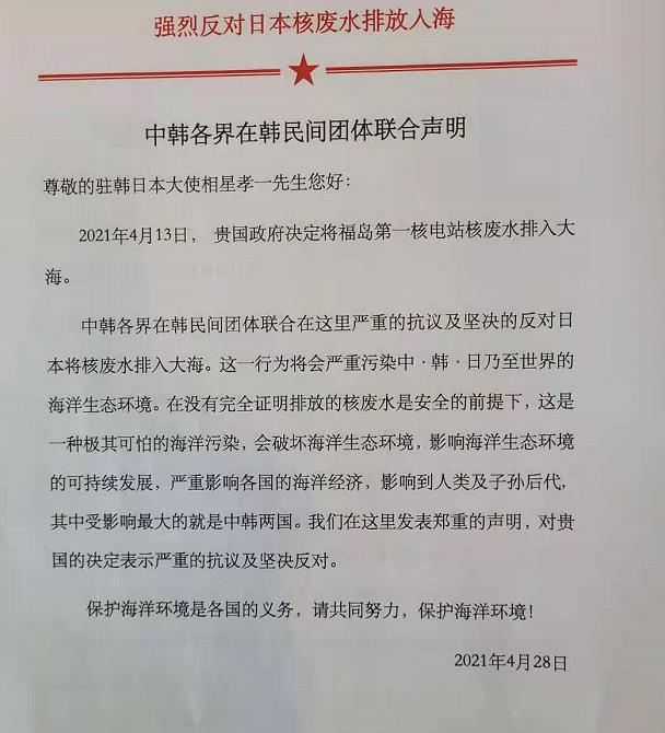 "在没有与周边国家进行协商的情况下,应该停止单方面污染海洋的行为。 以中韩两国国民对日本福岛核电站污水排放危险性的共同认识为基础而发表抗议声明,对污染物排放到海洋的严重情况深表忧虑","国际社会有必要共同应对,今后将计划加强中韩两国非政府组织之间的合作"。