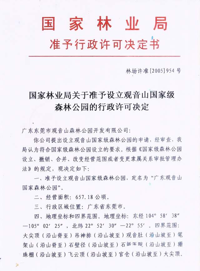 2005年12月23日,国家林业局批准为国家级森林公园确定:经营面积657.18公顷,行政区域位置广东省东莞市,地理坐标东经104°58′38″—105°02′25″,北纬22°52′30″—22°55″,四界范围大尖顶(沿山脊至)吊神排(沿山坡至)观音肚(沿山坡至)笔架山(沿山脊至)石壁径(沿山坡至)石新医院(沿山坡至))珊珠棚(沿山坡至)飞云顶(沿山坡至)官仓(沿山坡至)大尖顶。 同时,2007年7月30日,广东省林业局批准《广东观音山国家森林公园总体规划》的地理坐标和经营面积:东经104°05′16″—114°07′36″,北纬22°52′47″—22°54′59″,总面积598,10公顷。