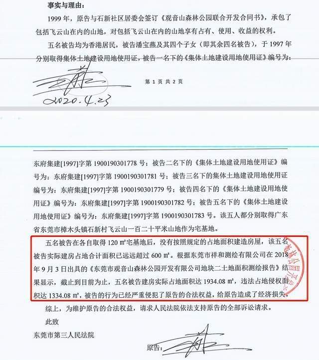 “判决书出来后,我们很诧异,明明违法占地面积事实清楚。”陈老师说,暂且抛开2002年香港居民潘宝燕及其四个子女,非法取得《集体土地建设用地使用证》的事不谈。潘宝燕及其四个子女均为香港居民,在1997年分别取得东莞市樟木头镇石新村飞云山120㎡山地作为宅基地。5个人,每人是120㎡,合计起来也就是600㎡。结果潘宝燕及其四个子女总用地面积高达1934㎡。