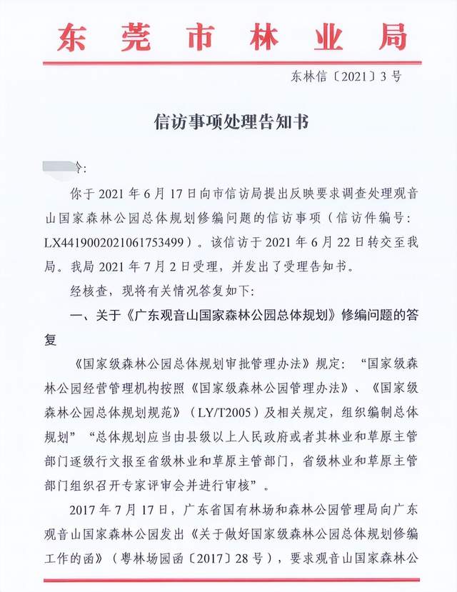 据观音山管理方透露,此前,在2021年6月17日观音山公园向东莞市信访局反映要求调查处理观音山国家森林公园总体规划修编问题的信访事项(信访件编号:LX4419002021061753499)。该信访经市信访局2021年6月22日转交至东莞市林业局。该局于2021年7月2日受理,并发出了受理告知书。