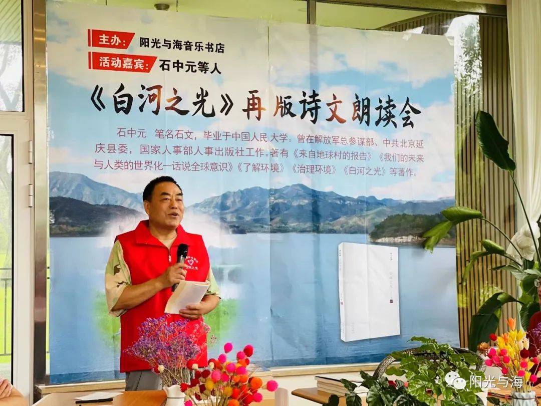 石老师每次都是穿着朴素的衣服,那些照片或者戴着草帽,或者推着自行车,或者在古老的压水井旁,今天的大雨,也是徒步走来,还读了《定风波》“一蓑烟雨任平生,也无风雨也无晴”的诗句。正式这种接近自然的灵魂,写出了文化性艺术性的报告文学《白河之光》。