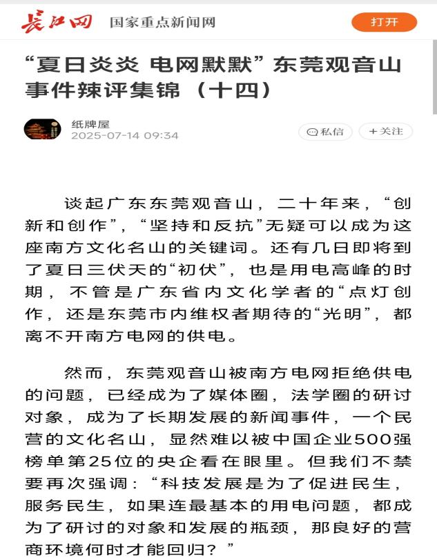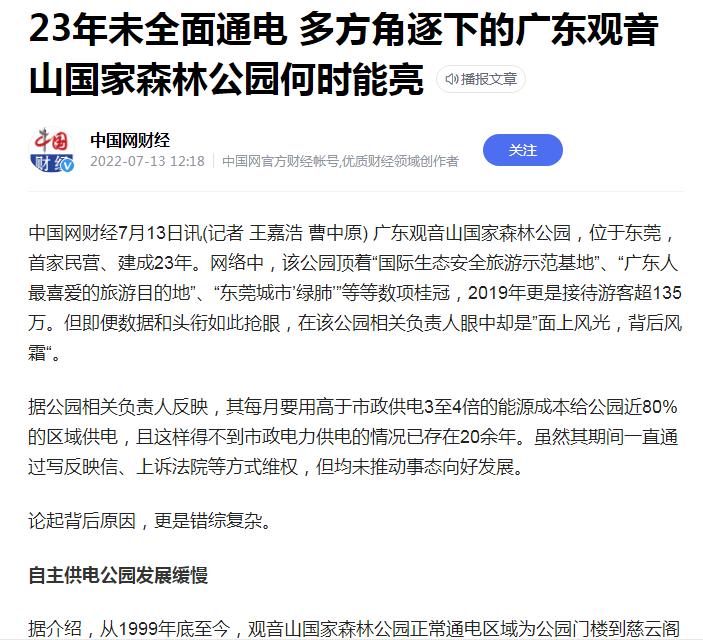 于是撰稿人仔细查看了这篇1万余字的文章,发现了又这么100字提及了南方电网问题“特别是南方电网属下的东莞市供电局拒绝给公园供电:2020年12月22日央视《谈事说理》栏目播出专题“《谈事说理》之搁浅的公园”其中就着重谈到观音山国家森林公园悬而未决的基本供电问题,之后全网和知名专家为之呼吁至今仍未解决。”同时配了一幅网文截图。