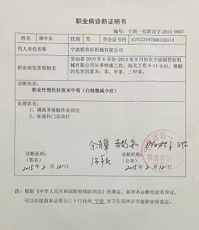 2014年9月10日,申请人谭中乐因生病在宁波小港医院做了健康检查,结果显示:也是相同的白细胞减少2.68。医生建议做职业病诊断。2015年2月12日,经宁波第一医院职业病诊断所诊断,申请人的白细胞减少确诊为“职业性慢性苯中毒,白细胞减少症”。