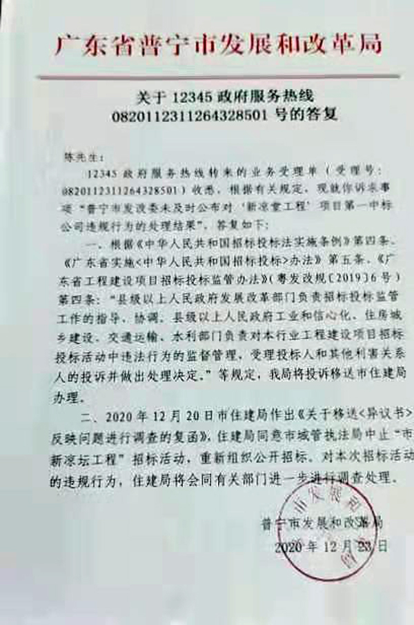 2020年12月20日,普宁市住房和城乡建设局复函普宁市城管执法局,同意中止本次招标活动,并重新委托招标代理机构组织公开招标活动。对本次招投标活动的违规行为,我局会同有关部门进一步调查处理。·12月23日,普宁市发展和改革局也答复称,将投诉移送市住建局办理;住建局将会同有关部门进一步进行调查处理。