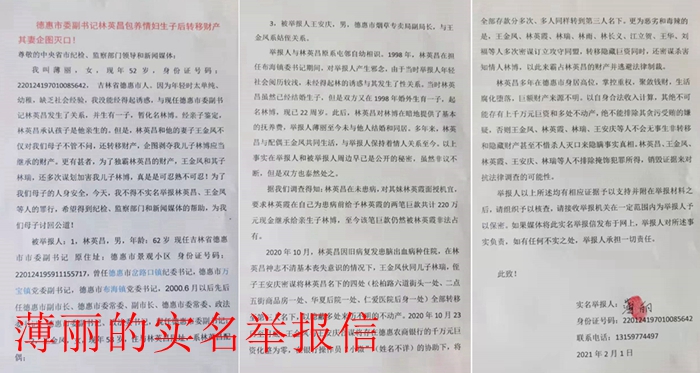 我叫薄丽,女,现年52岁,身份证号码:220124197010085642, 吉林省德惠市人。因为年轻时太单纯、幼稚,缺乏社会经验,我没能经得起诱惑,与现任吉林省德惠市委副书记林英昌发生了关系,并生有一子,暂化名林博。经亲子鉴定,林英昌承认孩子是他亲生的。但是,林英昌和他的妻子王金凤不仅对我们母子不管不问,还转移财产,企图剥夺我儿子林博应当继承的财产。更有甚者,为了独霸林英昌的财产,王金凤和其子林瑞,还多次谋划加害我儿子林博,真是是可忍熟不可忍!为了我们母子的人身安全,今天,我不得不实名举报林英昌、王金凤等人的罪行,希望得到纪检、监察部门和新闻媒体的帮助,为我们母子讨回公道!