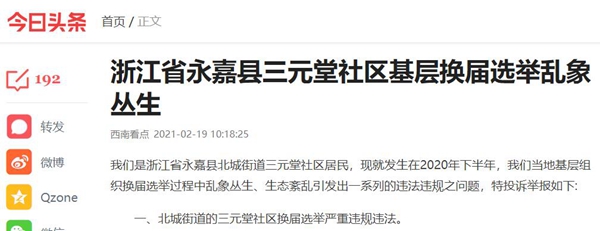 我们是浙江省永嘉县北城街道三元堂社区居民,现就发生在2020年下半年,我们当地基层组织换届选举过程中乱象丛生、政治生态紊乱引发出一系列的违法违规之问题,特投诉举报如下...