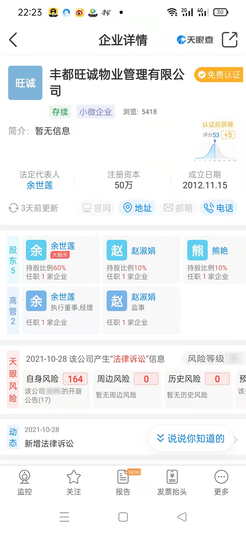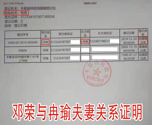 在记者跟随业主前往旺诚物业部了解情况时,物业部两个工人明确告知邓荣电话,并告诉记者“邓荣老婆冉瑜有股份,长期管理由邓荣负责”。记者当即查询了旺诚物业股东组织架构:旺诚物业原有法人冉瑜,民政局查询结果:冉瑜是邓荣合法妻子,邓荣害怕事情曝露,又将旺诚物业法人换成了冉瑜的母亲余世莲,也就是邓荣岳母。股东比例:余世莲占企业股份百分之六十。记者致电开发商时,其与业主说词一致,旺诚物业一直由邓荣撑控,这些信息小区大部分业主都知道。