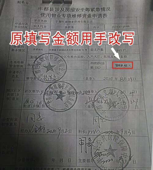 业主们综合大量证据后认定:邓荣利用其公务人员的职务便利成立家族企业,旺诚物业实际掌控人就是邓荣本人。在2019年至2020年,在小区业主完全不知情的情况下,邓荣以走紧急程序的手段,申报了物业专项维修资金,申请审批表中原填写金额用手写改为78430.48元。