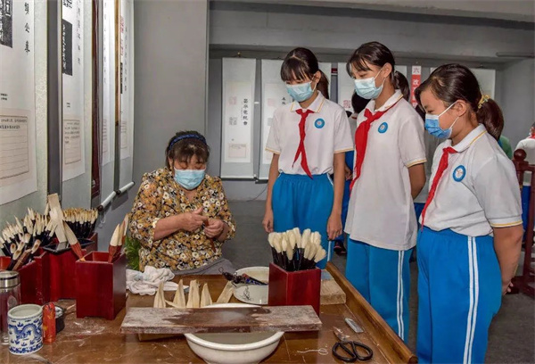 右一为刘建朋为学员们讲解毛笔制作过程