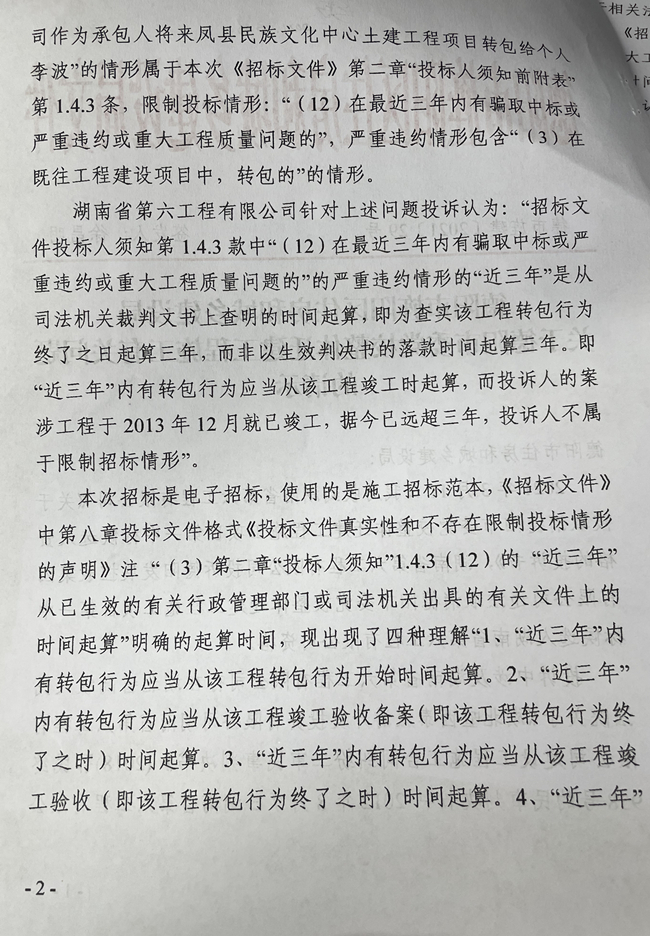 2021年12月22日,记者一行来到法定释法招投标业务主管单位四川省招标总站,请求对招标文件1.4.3(12)规定的事项,予以释法。四川省招投总站招投标监督科周科长介绍:为了避免法律条款打架,理解异议,规避因此导致的社会矛盾,四川省对招投标文件1.4.3(12)规定的事项,应以有关行政主管部门出具的生效的行政处罚决定书为依据,“近三年”应以行政处罚决定书的出具时间起算。并且,相关指导招投标文件早已下发给各市区县招标站,各地应遵照执行。