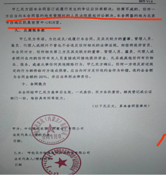 经牟波超等股东审查李博带来的中化现代农业(内蒙古)有限公司的制式合同发现:签约地址为北京,并且该合同第八条明确约定:“双方因签约或履行合同发生争议纠纷时,任何一方可向合同签约地有管辖权的人民法院诉讼解决。本合同签约地为北京市西城区凯晨世贸中心818室。”该地址为中化现代农业有限公司的注册、办公地址。