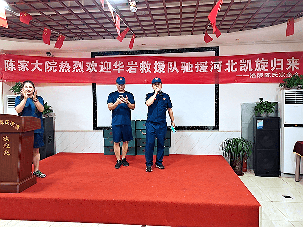 陈氏宗亲会秘书长陈廷卫在致辞中说:“代表涪陵陈氏宗亲会全体陈姓族人和陈家大院(江湖菜)对凯旋归来的驰援河北抗洪抢险英雄们表示热烈的欢迎!一方有难,八方支援。在抢险救灾过程中,统筹兼顾,协调有力,措施得当,发挥了榜样的作用。接下来,将带领涪陵辖区的陈姓族人,学习和弘扬华岩救援队队伍的能战斗、能克硬、能吃苦、有爱心的精神。”