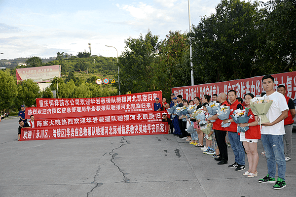 下午6:50时许,“回来啦,回来啦!”等候已久的迎接人员手捧鲜花,拉举“热烈欢迎涪陵区应急管理局华岩救援队驰援河北凯旋归来!”、“欢迎(永川区、涪陵区)华岩应急救援队驰援河北涿州抗洪救灾英雄平安回家!”、“陈家大院热烈欢迎华岩救援队驰援河北凯旋归来——涪陵陈氏宗亲会”、“重庆恒祥防水公司欢迎华岩救援队驰援河北凯旋归来!”横幅兴奋的欢呼。