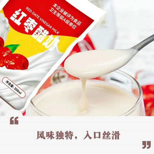 一款醋奶口感如何,取决于酸奶发酵时间的长短。这款红枣醋奶通过慢发酵技术,使其拥有丝滑般顺滑的口感,简直就是奶中佳品。既有喝饮料的满足感,也有开胃解腻的效果,整体能带给你恰到好处的美妙体验。