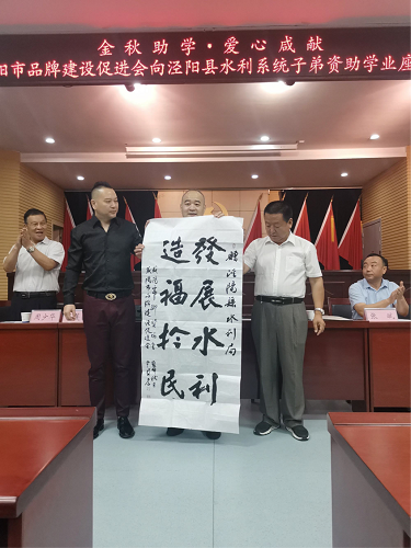 咸阳市乡贤协会和品促会向泾阳县水利局赠送了著名书法家成中艾老师书写的“发展水利、造福于民”书法作品。爱心企业代表黄荟臻致辞向21名学子表示热烈祝贺,并给予殷切的希望!