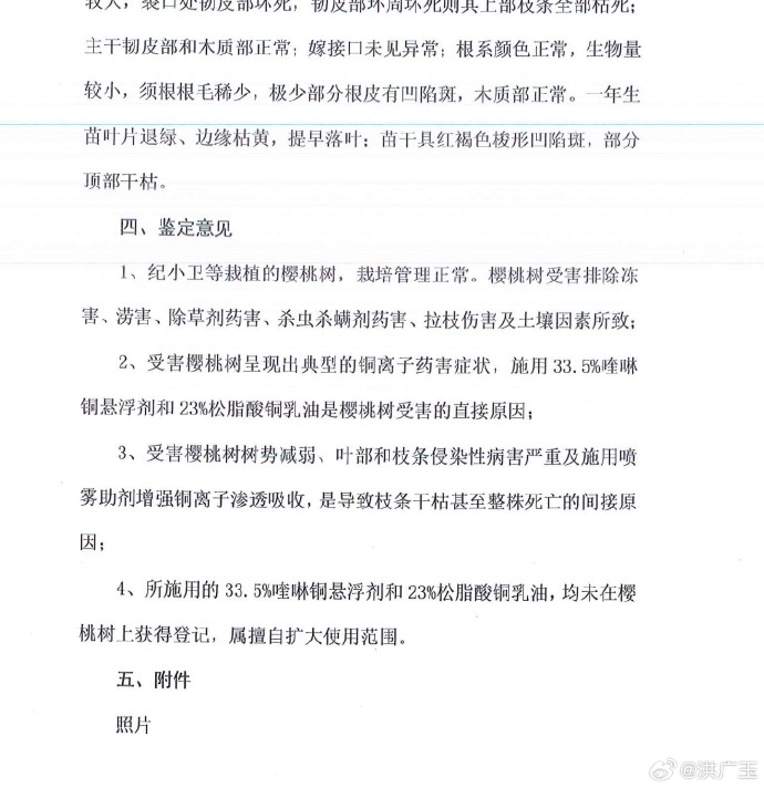 直接上答案。樱桃树死了后,2022年10月,宫梁术、纪小卫等农户请具备司法资质的鉴定机构做了死因鉴定——鉴定团队包括农药专家、樱桃树培育专家以及植保专家,鉴定结论为 “受害樱桃树呈现出典型的铜离子药害症状,施用33.5%喹啉铜悬浮剂和23%松脂酸铜乳油是樱桃树受害的直接原因。(图2、3)