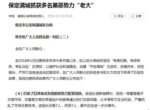 随着扫黑除恶专项斗争的不断深入,一批涉黑涉恶犯罪分子纷纷落网。2019年12月10日,当地公安机关发布消息:“打掉了以孙某武为首的恶势力犯罪团伙。该团伙垄断南韩村、段旺一带葡萄箱子交易市场,在葡萄交易旺季强迫外地客商通过他们买卖纸箱,从中谋取不正当利益,严重扰乱了市场交易秩序。该团伙涉案7人,抓获7人,案件正在进一步办理中。”
