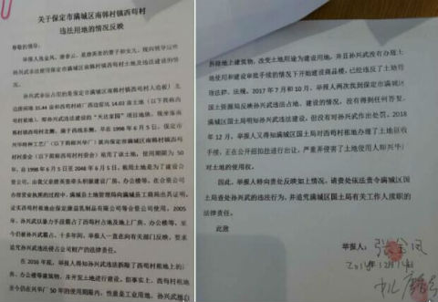 第二天,我父亲唐英奎就向南韩村镇派出所报案,未获受理。又找南韩村镇政府、满城县公安局,都说我父亲自愿和孙某武签了协议。就这么找了两年,看着刚投产的公司被孙某武侵占,我父亲悲愤交加,在2007年含冤去世。此后,我母亲一直向上反映情况,至2014年老人家实在是精力不支,才允许我参与进来。