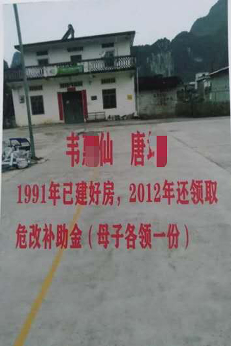 其二,为了扩大他们的势力范围,首先是利用国家危房改造资金,把国家的钱变成自己的钱,想尽一切办法做假材料。为了顺利拿到危房改造资金,叫部分家庭及时到派出所更换户主,以便于为那些退休公职人员的家属定要拿得一份危房改造指标,送人情,严重违反了“都安办发(2020)3号”文件第八条的有关规定”。如:茶上屯的唐某隆连房子都不建,也得了一份危房改造指标;违某柳2016年危房改造资金已到账,至今房子也没有建起来。像这样的案例有很多很多,只要上级部门派人员实地调查,水清石头就现了。
