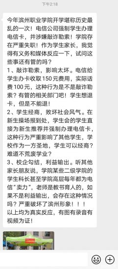 职业学院学生家长爆料:今年滨州职业学院开学堪称历史最乱的一次!电信公司强制学生办理电信卡!学院存在严重管理失职!作为学生家长,我觉得有义务和媒体反应一下,试问这些事还有管的吗?