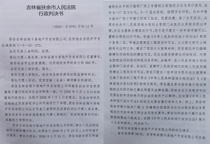 德卡公司,全称“吉林省德卡房地产开发有限公司”,是通过招商引资进入扶余市的民营企业。据扶余市人民法院行政判决书(【2020】吉0781行初12号)记载:2020年2月24日,德卡公司就向被告扶余市自然资源局提交申请书一份,请求被告对原告所有的位于扶余市德卡城市广场已竣工验收完的2号楼宾馆8-17层改为住宅进行使用一事进行批示,但被告自收到该申请书至今未有任何书面或口头的回复,属严重的行政不作为。原告无奈,于7月1日,到扶余市法院对被告提起行政诉讼,请求人民法院依法支持原告的诉讼请求。