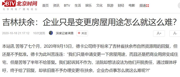 德卡公司认为,这仍然是在用旧规搪塞、敷衍、糊弄、应付企业,与党中央、国务院、最高法和各级政府出台的新政策相抵触。德卡公司称:《中华人民共和国城乡规划法》和《吉林省城乡规划条例》所针对的,都是在建工程或者未建工程,而我们德卡公司则是已经建设完工的工程,更不是改扩建工程,只是需要变更一下用途,将部分建筑由商业用房变更为住宅用房,并不是规划条例所说的情形。而且,由商业用房变更为住宅用房,这本来就是企业受损的,也是极其简单的审批程序,何况当初审批的用地性质也是商服、住宅。自然资源局这样做,纯粹是有意难为企业,严重影响了企业和地方的经济发展,是令人不能忍受的典型的官僚衙门作风。不仅如此,德卡公司还说,在扶余还遭遇到一些奇怪的现象:近日在另外一起经济纠纷中,德卡要起诉对方,却一个月都立不上案。而在此前的一段时间里,凡是起诉德卡公司的,却能够得到鼓励,甚至可以缓交起诉费。这,不仅仅是营商环境恶劣的问题了,甚至可以说,就是对企业的赤裸裸的谋杀!我们按照政府的要求投资建设医院后,政府却翻脸不认账、拒绝兑现当初的承诺;我们帮助政府修路后,政府还是违背承诺;如今连我们想改变一下房屋用途这点小事都不给办了,我们明显感受到政府的行为是德卡公司已经投完资了就没用了,所以就连这么点小事都不予批准。在扶余,有过类似德卡公司这种遭遇的企业比比皆是,有的已经被“剿灭”了。人们都经常说:投资不过山海关,而在扶余则是“敞开门招商,关起门打狗!”我们强烈期盼着党中央、国务院和中纪委、省纪委及巡视组领导能够重视我们企业的遭遇,切实把对企业的好政策落到实处,彻底改善营商环境,否则什么样的企业都难以存活,更不要谈发展了。