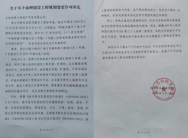 苦等了七个月,2020年9月13日,德卡公司终于盼来了吉林省扶余市自然资源局的回复,但还是不予批准。德卡为此叫苦连连:我们只是申请变更一下房屋用途,而且还是把商业用房变成住...